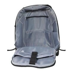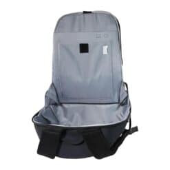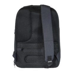 Glidelås til åpning av hovedrom er inn mot rygg. Lomme med glidelås på bakside mot rygg for trygg oppbevaring av verdisaker. Det er også en lomme med glidelås i siden. God polstring og myk mesh i rygg, samt bærestropper. Innvendig er det lyst grått fôr av nylon. Eget rom til bærbar pc opp til 17 tommer.