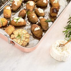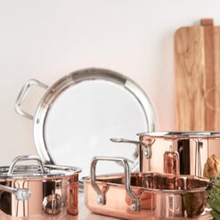 Eksklusiv ovnsform i kobber med tre lag. Det første laget er det utvendige laget av kobber, og innsiden består av et lag aluminium og et lag rustfritt stål som gjør gryten enkel å rengjøre. Kobber- og aluminiumslagene leder varme godt, noe som gjør at gryten varmes opp hurtig og jevnt. Bunnen er forsterket med en tykk rustfri stålplate slik at det er mulig å bruke gryten på en induksjonsplate. Formen har håndtak i rustfritt stål som holder seg kjølig under tilberedingen. Egnet for alle stekeplater, inkludert induksjonsplater. Størrelse: 35 x 25 x 6 cm, 5,2 L. Leveres i gaveeske.