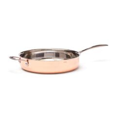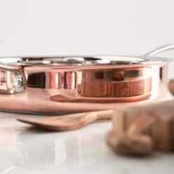 Eksklusiv sautégryte i kobber med lokk. Det første laget er det utvendige laget av kobber, og innsiden består av et lag aluminium og et lag rustfritt stål som gjør gryten enkel å rengjøre. Kobber- og aluminiumslagene leder varme godt, noe som gjør at gryten varmes opp hurtig og jevnt. Bunnen er forsterket med en tykk rustfri stålplate slik at det er mulig å bruke gryten på en induksjonsplate. Gryten har et håndtak i rustfritt stål som holder seg kjølig under tilberedning. Egnet for alle stekeplater, inkludert induksjonsplater. Størrelse: 28 x 28 x 6 cm, 3,5 L. Leveres i gaveeske.