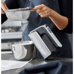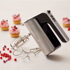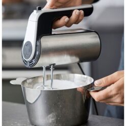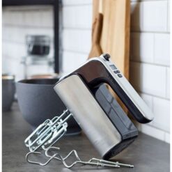 Blomsterbergs håndmikser med kraftig 350 watt motor i kompakt design i svart plast og rustfritt stål. Blått LED display, som viser hastighet og tidsforbruk, fem hastigheter med turbofunksjon. To vanlige visper og to deigkroker følger med. Håndmikseren er designet slik at den kan stå oppreist, noe som gjør den enklere å oppbevare.