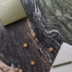 Her kommer Yatzy i luksusforpakning! Med terninger i gull og med en like eksklusiv penn, hever vi Yatzy til Bratzy. Presentert i en stilig eske trykt med gulltekst, er dette spillet både fint å gi bort og å ha liggende på sofabordet.