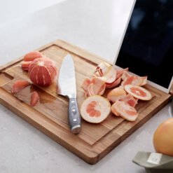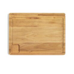 Skjære-/ serveringsbrett med en overflate på 40 x 30 cm, noe som betyr at det er stort nok for å skjære, forberede og servere. Brettet er utstyrt med en praktisk holder til nettbrettet eller mobiltelefonen, slik at du enkelt kan bruke det mens du følger dine favorittoppskrifter på nett. Det er også et praktisk væskespor slik at væske lett kan helles ut gjennom hellingselementet, og du unngår unødvendig søl. Laget av FSC-sertifisert teak. Størrelse: 40 x 30 x 2 cm. Leveres i gaveeske.