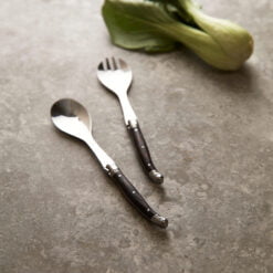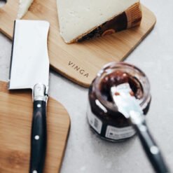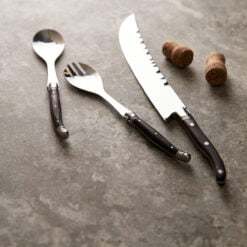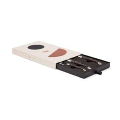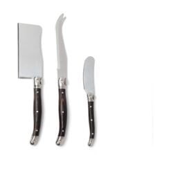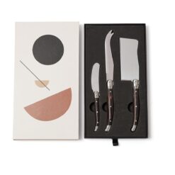 Et eksklusivt sett til ost, bestående av to ostekniver og en smørkniv med sort håndtak laget av pakkatre og rustfritt stål. Pakket inn i en eksklusiv gavepakke.