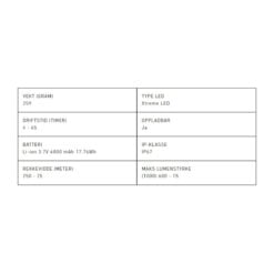 Lykten drives av et oppladbart Li-ion batteri på 4800 mAh. Lykten lades enkelt med den medfølgende magnetiske ladekabelen. Lykten lyser med Constant Light som gjør at den holder samme lysnivå lenger enn før.