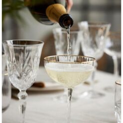 Lyngby Glas Palermo. Det elegante, mønstrede designet med en fin gullkant gir glasset en fin vintagelook, som samtidig gjenspeiler tidens trender. Server vann, vin, juice eller drinker i glasset, og la de fine fasettene reflektere lyset og glassets innhold på en vakker måte.