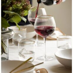 Lyngby Glas Palermo. Det elegante, mønstrede designet med en fin gullkant gir glasset en fin vintagelook, som samtidig gjenspeiler tidens trender. Server vann, vin, juice eller drinker i glasset, og la de fine fasettene reflektere lyset og glassets innhold på en vakker måte.