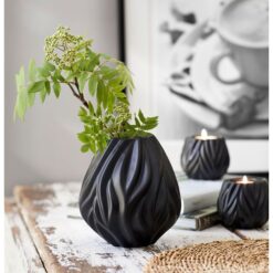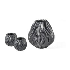 Flame vase, 19 cm høy, samt et sett av to Flame telysestaker i samme skulpturelle design som vasen, alle deler av porselen med en vakker, matt svart glasur. Vasens og stakenes organiske mønster leder tankene til ild og flammer. Design Peter Svarrer.