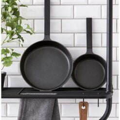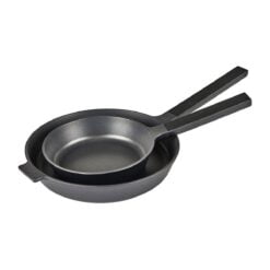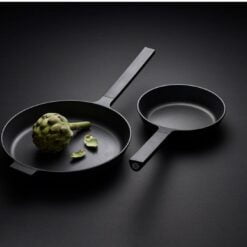 Aluminium er et av de mest varmeledende materialene. Det fordeler og holder på varmen jevnt og energieffektivt over både bunn og sider, og samtidig er materialet lett. Det kan brukes på alle varmekilder. Gavepakken består av to stekepanner, 20 og 28 cm, laget av støpt aluminium med håndtak av bakelitt. Pannene har innvendig trelags non stick-belegg som reduserer risikoen for at maten brenner seg fast, og beskyttende utvendig belegg som forenkler rengjøringen. Kan brukes på alle varmekilder. Design Klaus Rath.